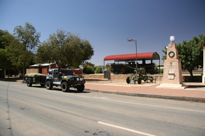 | Above right - Main Street with old Hotels - looks like a real nice Outback town - potential which needs money. Left and Right - an old train again and War Memorial including the Monster Truck and Trailer. |