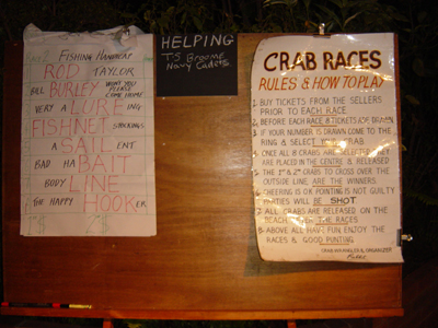 | The rules and the names of the crabs for the second race... the story is nicely done and fun to watch. We bought tickets but did not get a crab drawn to our tickets. |