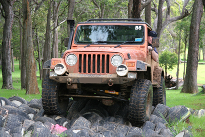 | Eddie's XJ showing the Rubicon obstacle. Those are man-made concrete pieces with markers which need to be touched with the wheels. You need a good spoter and patience as the driver to make it through this obstacle. |