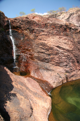 running into the top plunge pool. Below the view from the river onto the two plunge pools and the lower and larger pool -