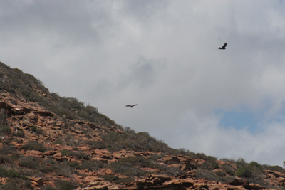| Nice wildflowers on the walk to Eagle Beach, above the cliffs along the beach and on the right below the Eagles which gave the name to the coastal gorge. Lots of large orange and purple crabs under the cliffs. |